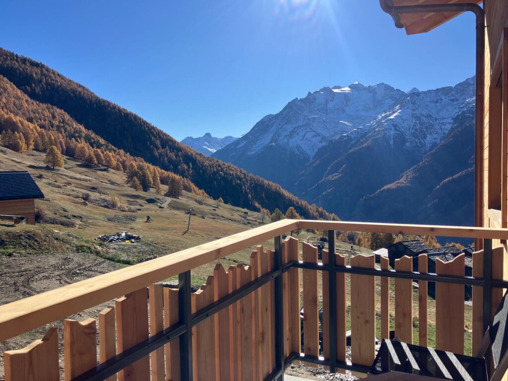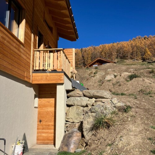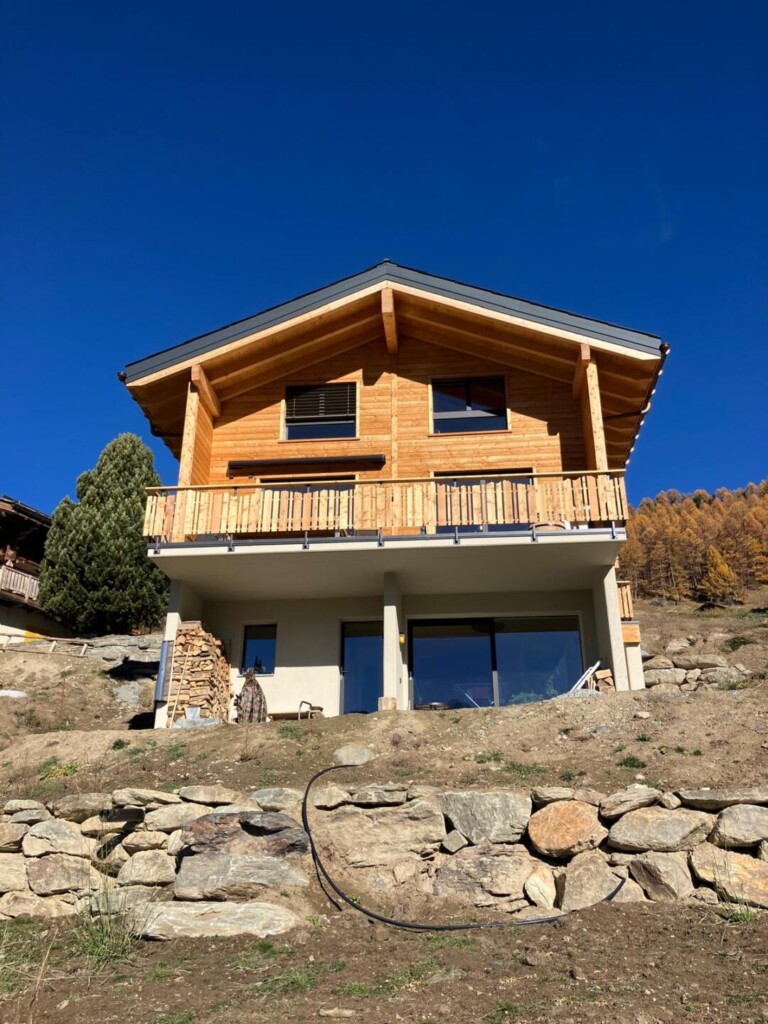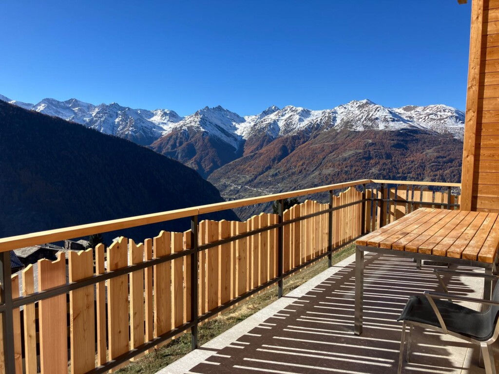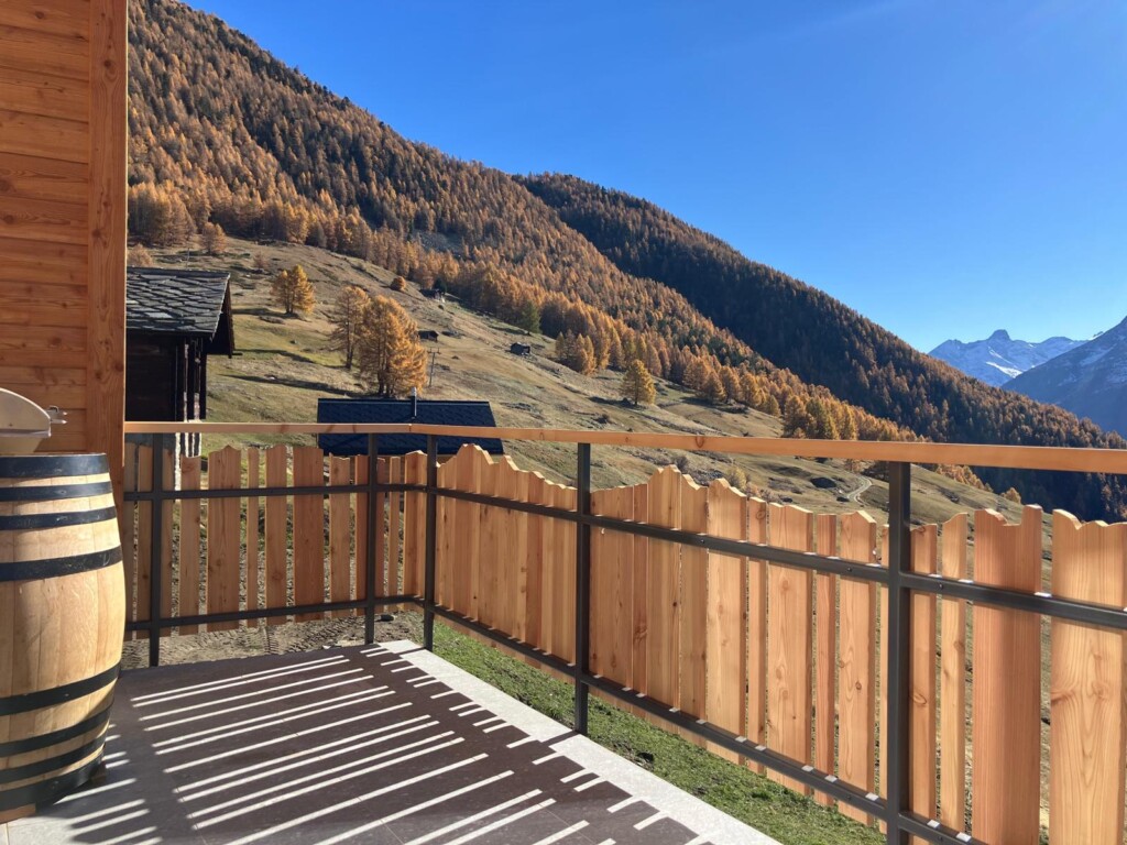 Perfekt dem Stil des Hauses angepasst – das feuerverzinkte und pulverbeschichtete Geländer fügt sich harmonisch in die Umgebung ein. Die Frontterrasse bietet eine spektakuläre Aussicht, während die Seitenterrasse mit Treppenaufgang und praktischem Törli zusätzlichen Komfort und Sicherheit schafft. Robust, elegant und ideal ins Gesamtbild integriert.
